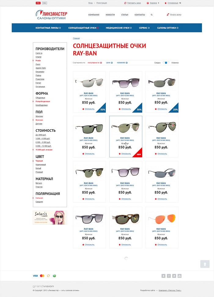 Фильтр Многофункциональный фильтр товаров позволяет отсортировать товар по многим параметрам: производитель, форма, пол, стоимость, цвет, материал, поляризация. |