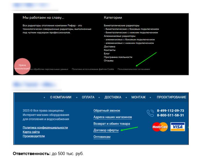Пример одного из пунктов аудита. На сайте отсутствовала ссылка на страницу «Пользовательского соглашения». Для сравнения были приведены примеры трех конкурентов и прописана ответственность за несоблюдение закона.