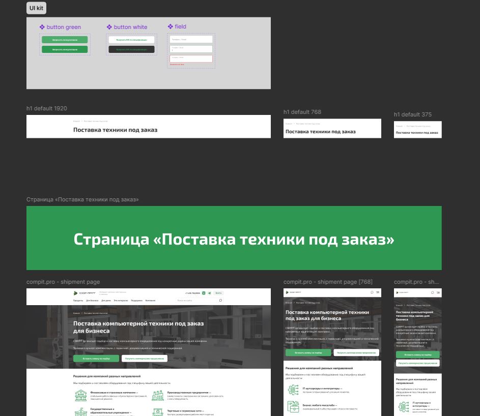 SEO-специалист подготовил подробное ТЗ, а дизайнер отрисовал макет в Figma для трех разрешений: ПК, планшет и мобильные устройства, используя UI-kit.