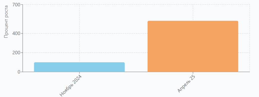За полтора года(ноябрь 2024 — апрель 2025) поисковый трафик без брендовых запросов вырос в 5,3 раза — это прирост на 431%.