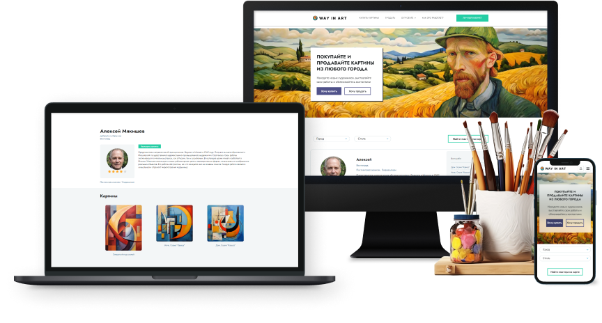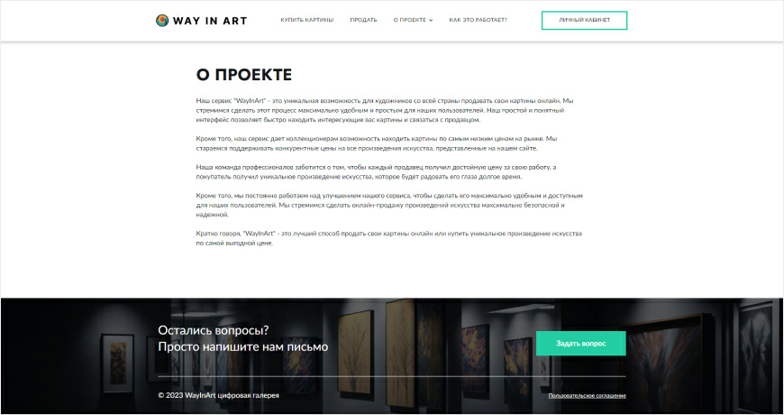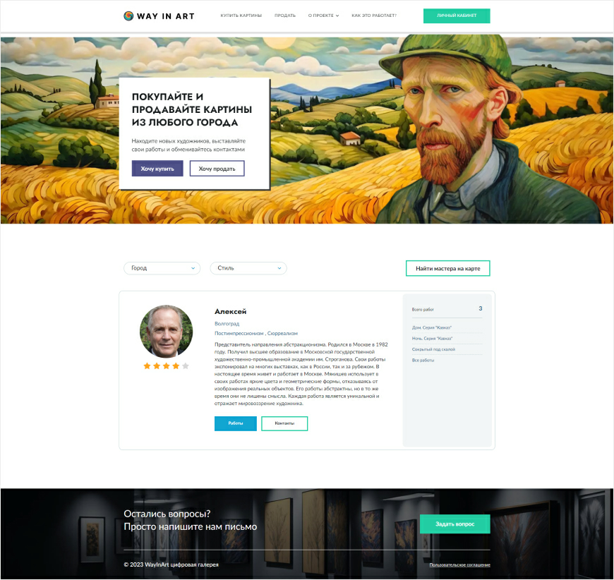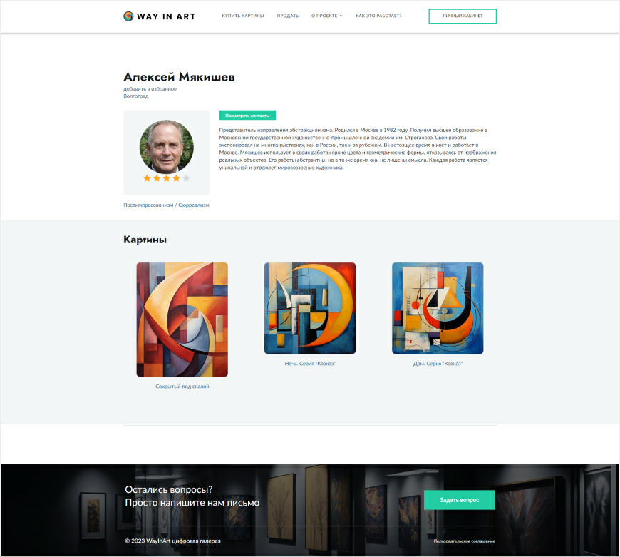 Страница аккаунта Страница аккаунта с личной информацией о художнике и картинами. |