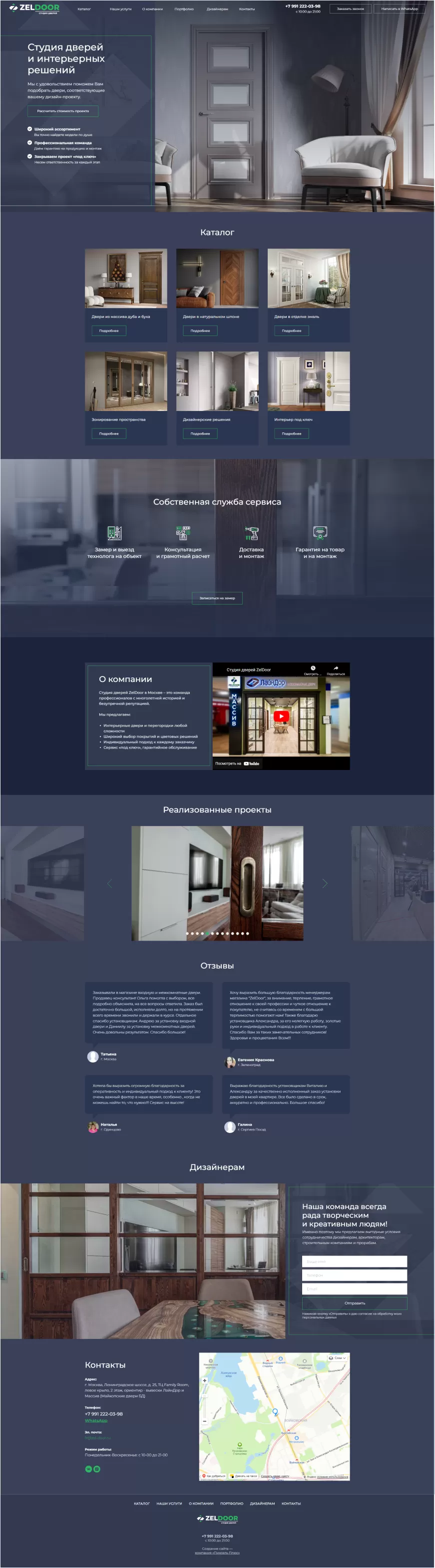 Главная страница с каталогом видео презентацией, отзывами и формой обратной связи.