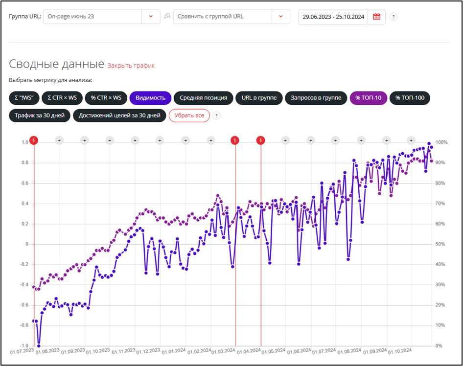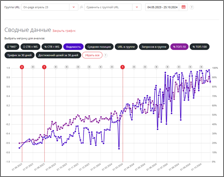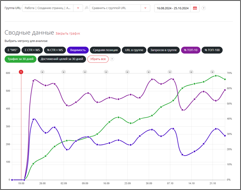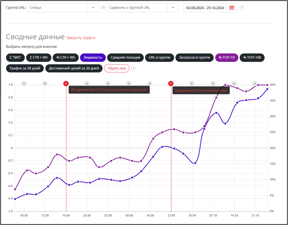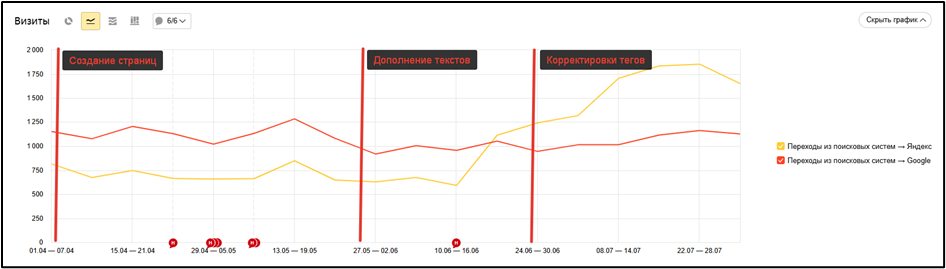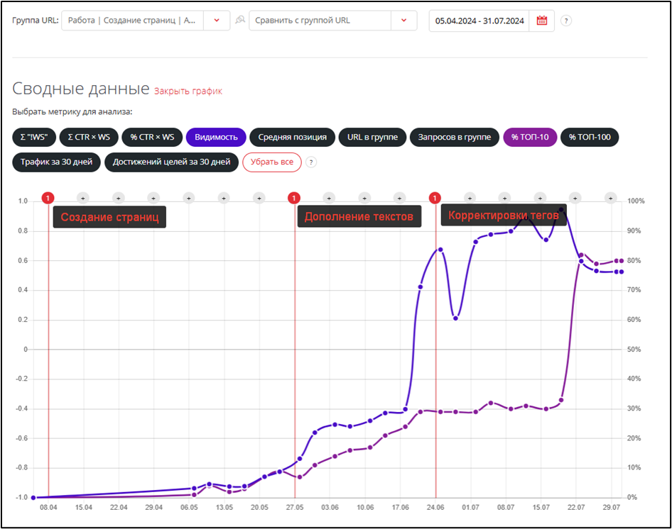Например, чтобы протестировать гипотезу, внедряем правки на небольшой группе страниц. Если в результате наблюдаем рост видимости или другие позитивные изменения, значит, гипотеза подтвердилась, и ее можно масштабировать.