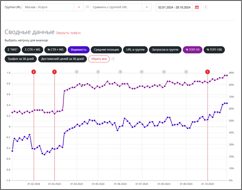 В результате получили рост видимости и процента запросов в ТОП-10. Данные по страницам филиала в Екатеринбурге: