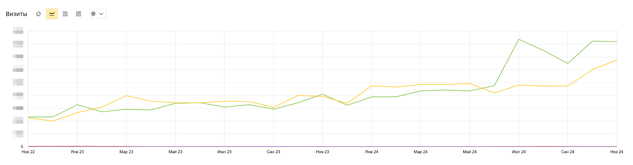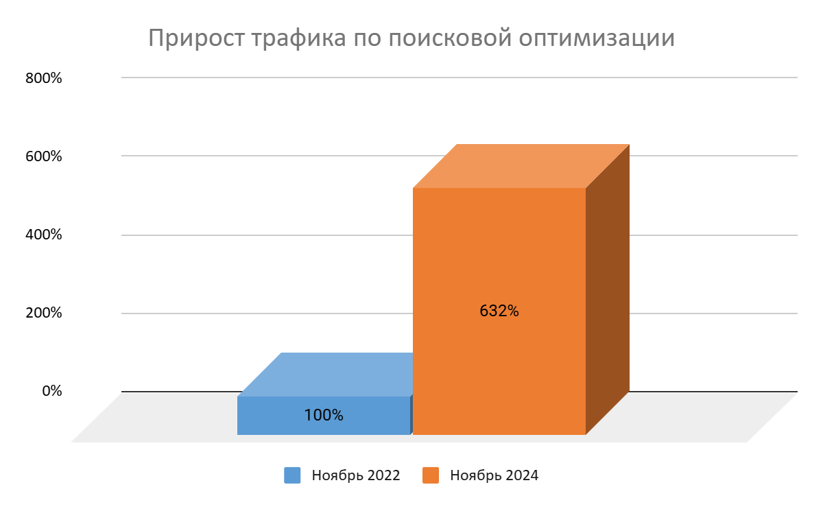 Трафик из поисковых систем за два года (с ноября 2022 года по ноябрь 2024 года) вырос на 532% —более чем в шесть раз без брендовых запросов.