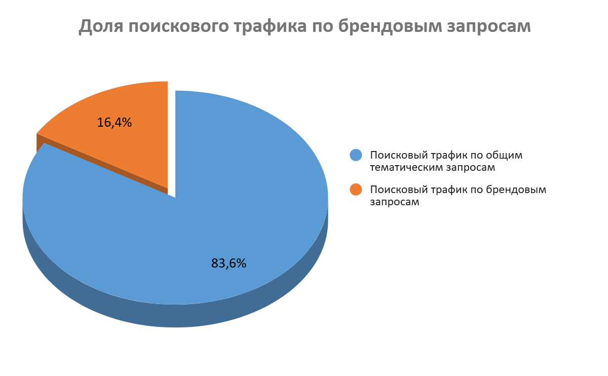 Доля поискового трафика по брендовым запросам (с названием компании) составляет 16,44%. Поисковый трафик по общим тематическим запросам — 83,56%.