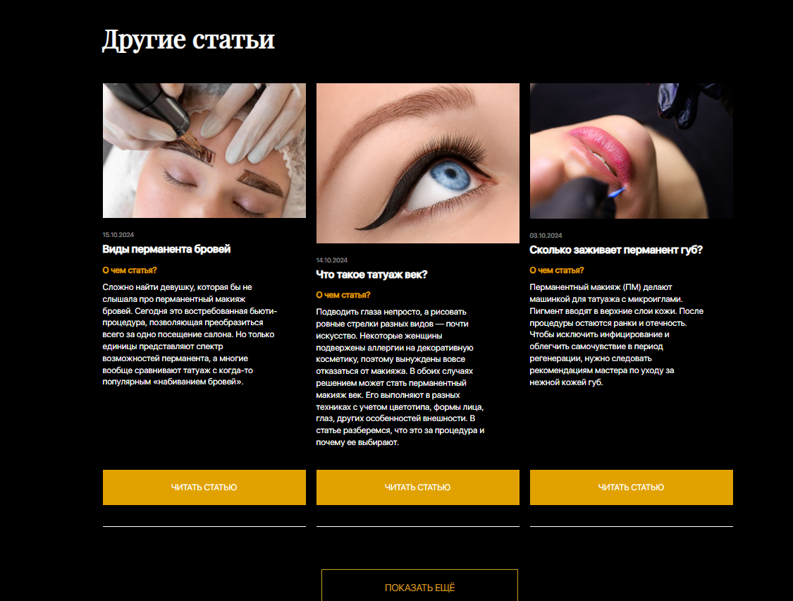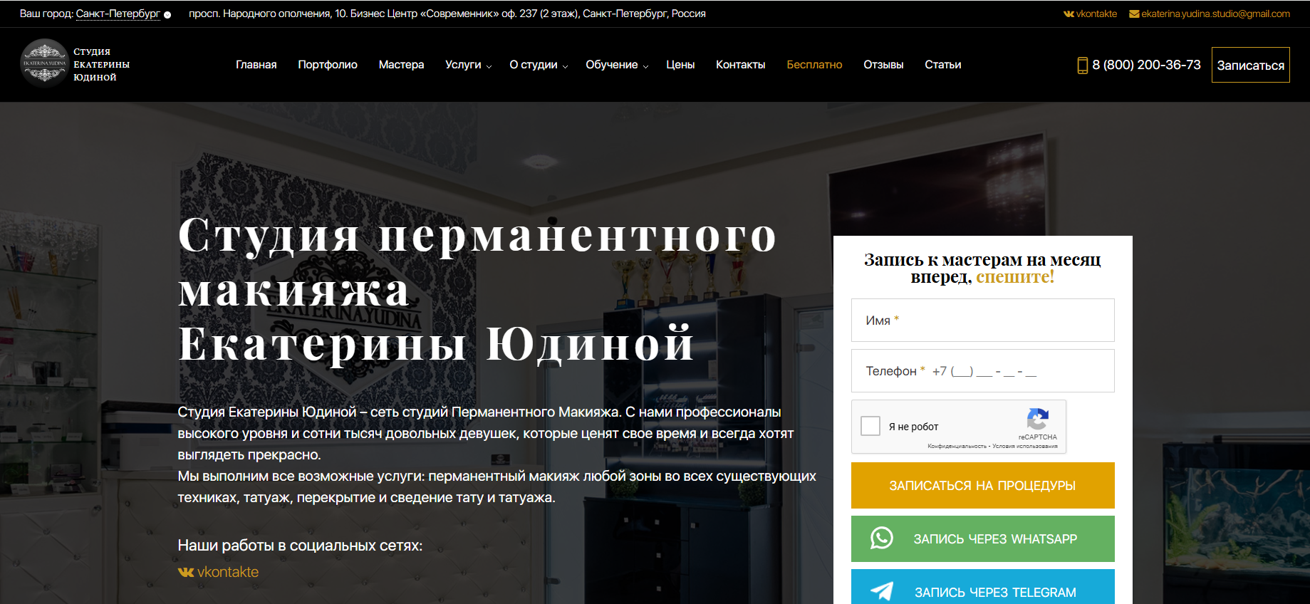 Yudinastudio.ru — студия перманентного макияжа Екатерины Юдиной. Мастера работают в разных техниках, проводят не только популярные процедуры — татуаж бровей, век и губ, — но и оказывают более редкие услуги, например, делают дермопигментацию (восстановление естественного цвета кожи) и трихопигментацию (визуальное восстановление густоты волос).