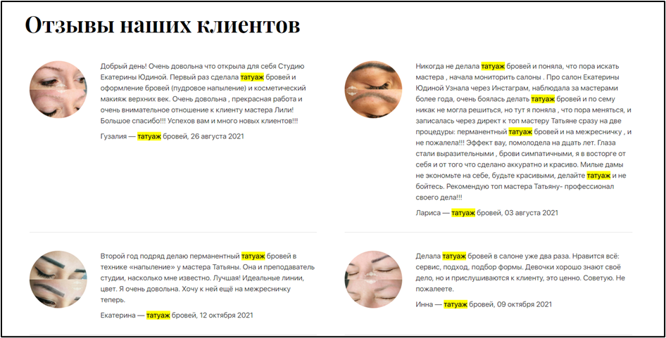 Мы вывели в ТОП-10 поисковых систем 69% семантического ядра. Проект занимает позиции в ТОП-10 Яндекса и Google по целевым запросам в тематике «Татуаж», вот некоторые из них: