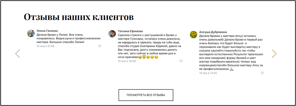 Мы поменяли формат отзывов — вместо текстов разместили скриншоты из соцсети ВКонтакте. Это помогло избавиться от переспама. Кроме того, формат скриншотов выглядит реалистичнее и вызывает больше доверия.