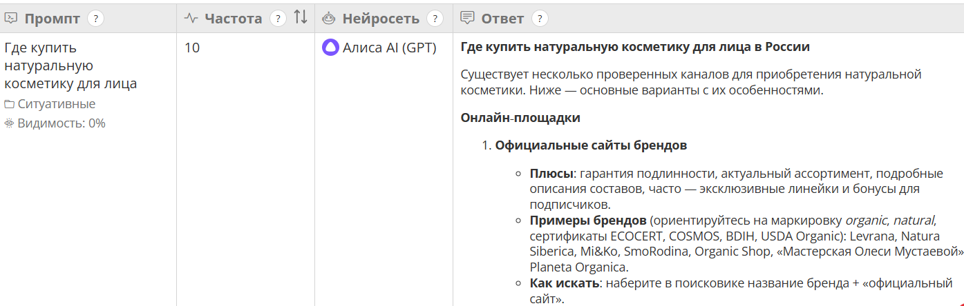 Если коротко: классического SEO уже недостаточно, чтобы косметический бренд стабильно попадал в ответы ИИ. Нужно понимать, по каким промптам модели формируют ответы, кого они уже упоминают и из каких источников собирают бренды и сайты.
