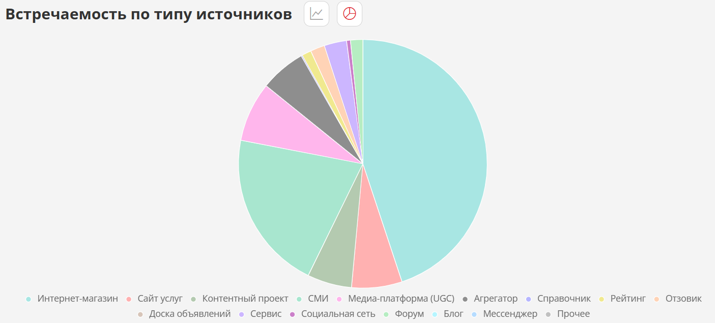 После анализа источников обычно становится видна довольно показательная картина. В одном из таких разборов круговая диаграмма типов источников показала, что 47% источников (по 145 промптам, заведенным в проект https://ai.pixeltools.ru/) — это интернет-магазины.